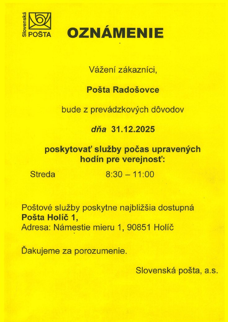 Pošta Radošovce bude dňa