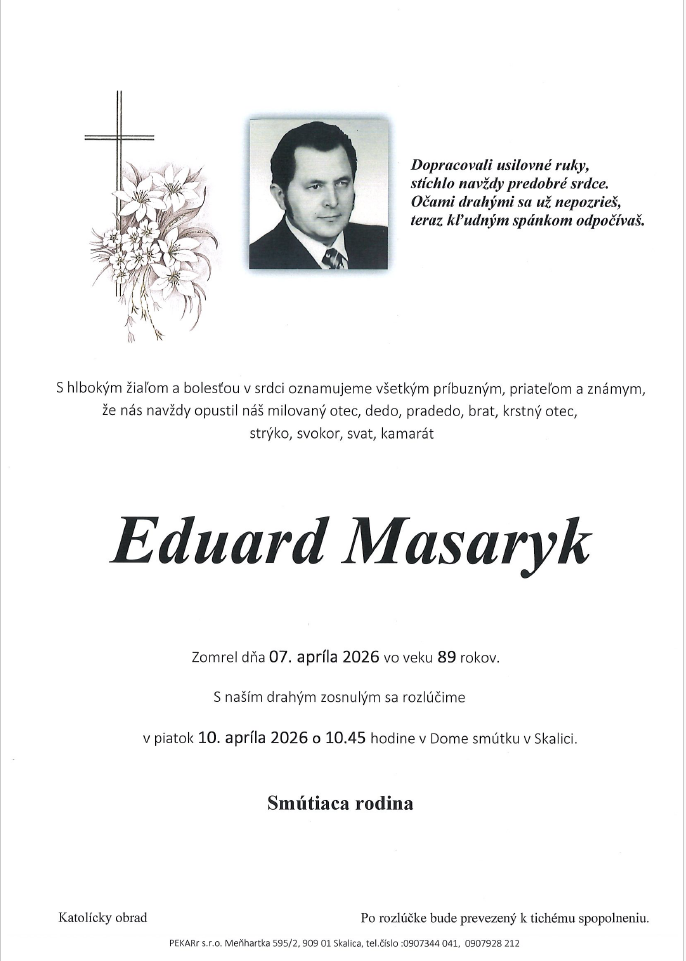 Smútočný oznam – Eduard Masaryk – rodák z Duboviec