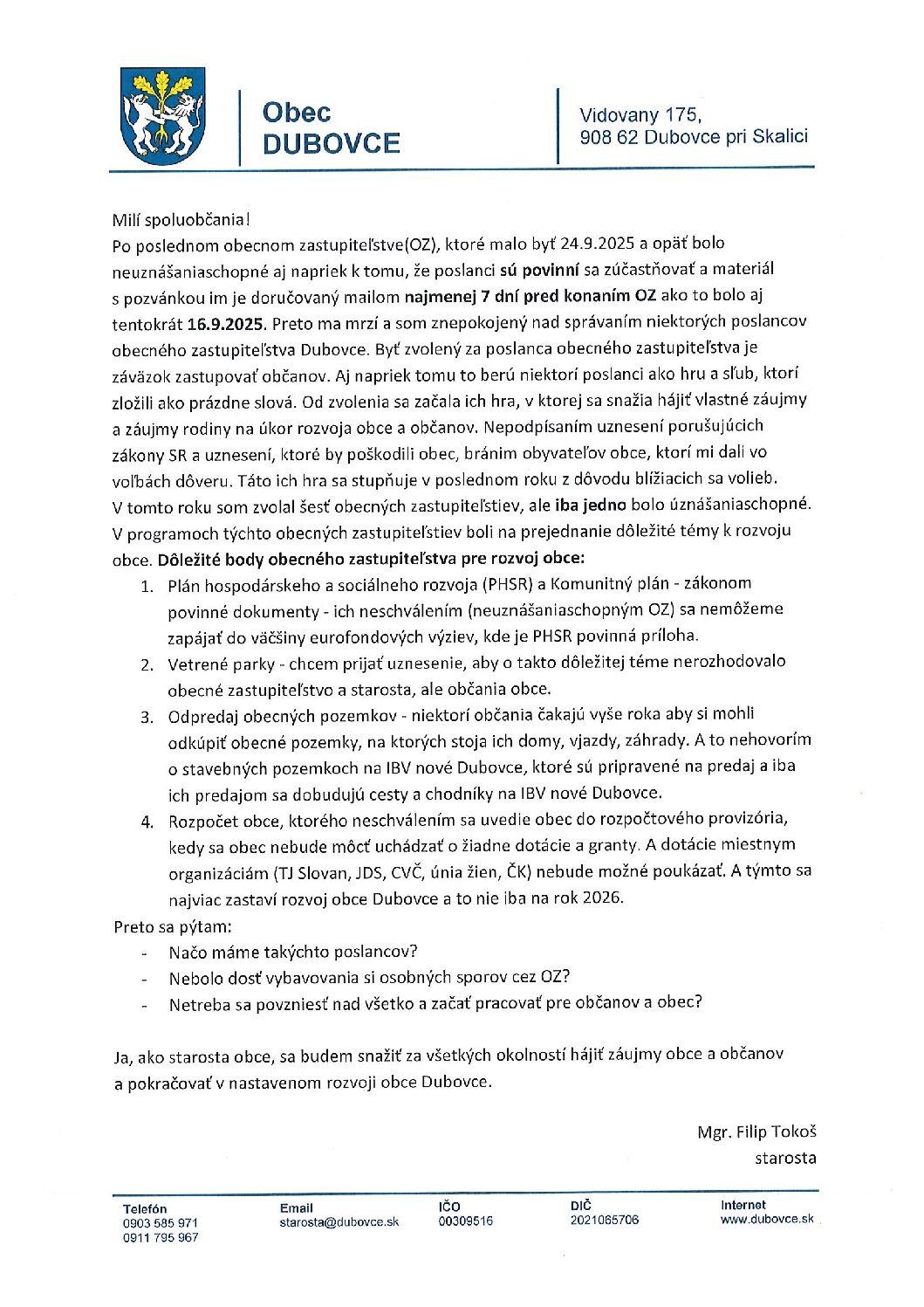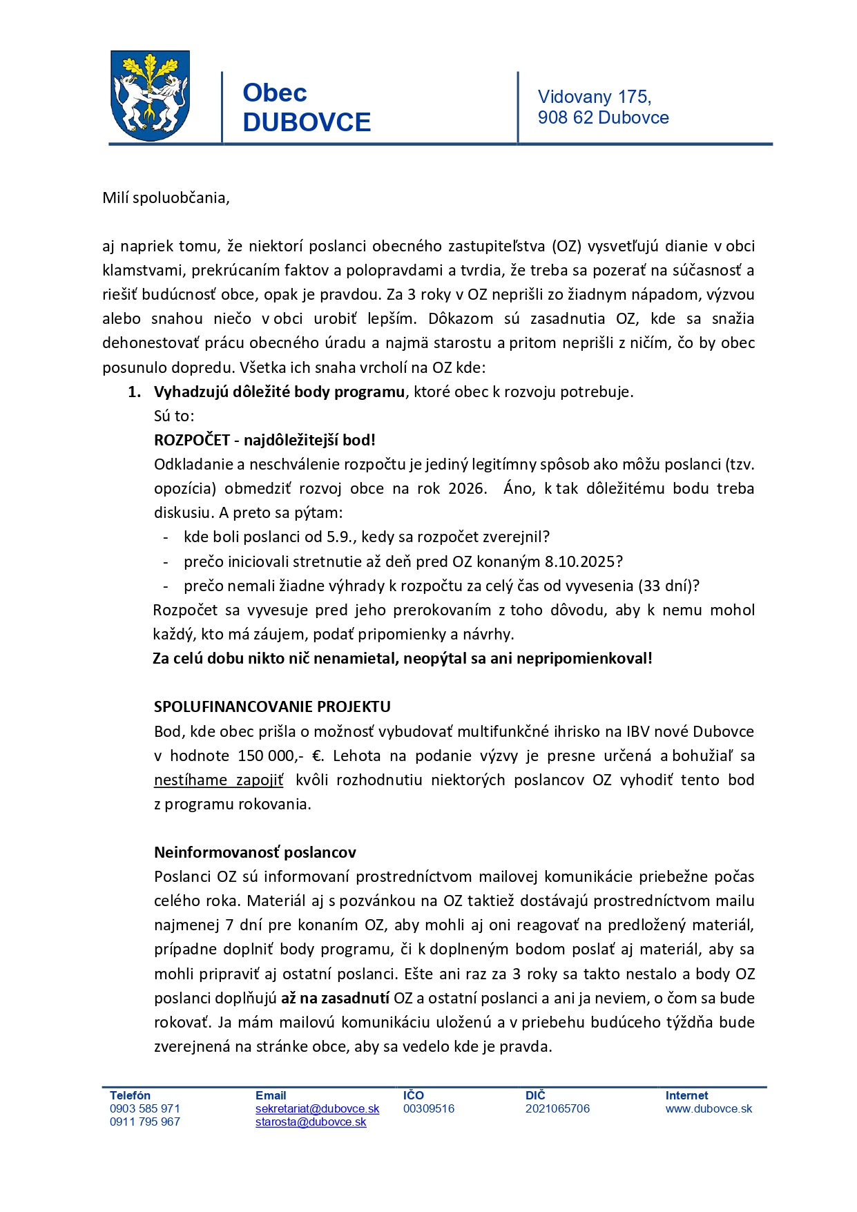 Vyjadrenie starostu k zasadnutiu obecného zastupiteľstva konanému dňa 15. 12. 2025