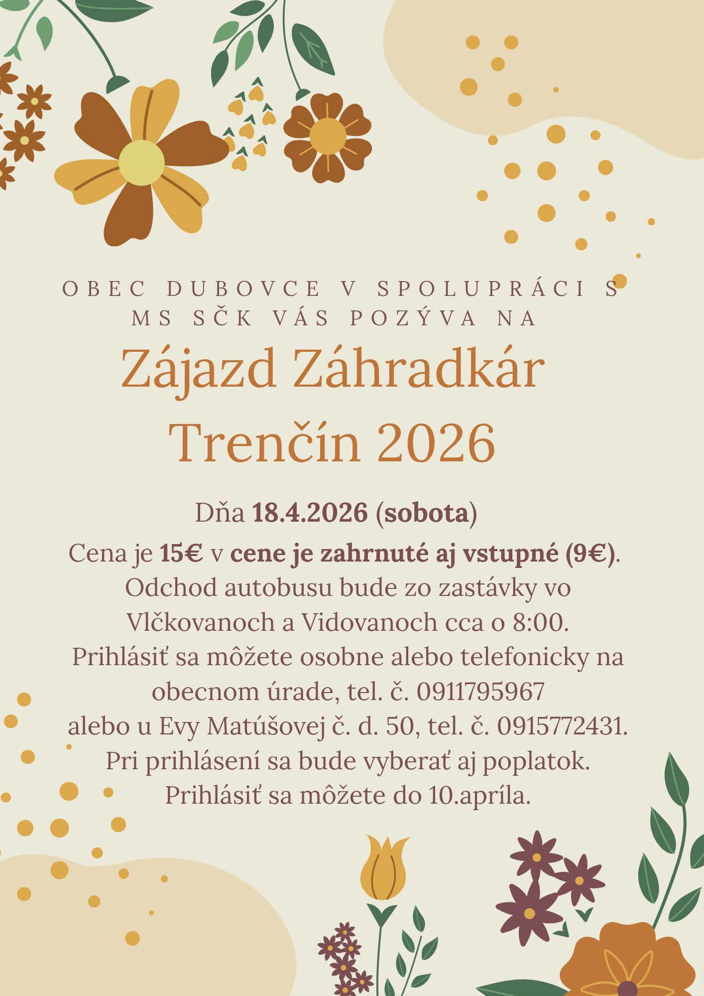 Obec Dubovce v spolupráci s MS SČK vás srdečne pozýva na zájazd na obľúbený veľtrh ZÁHRADKÁR v Trenčíne