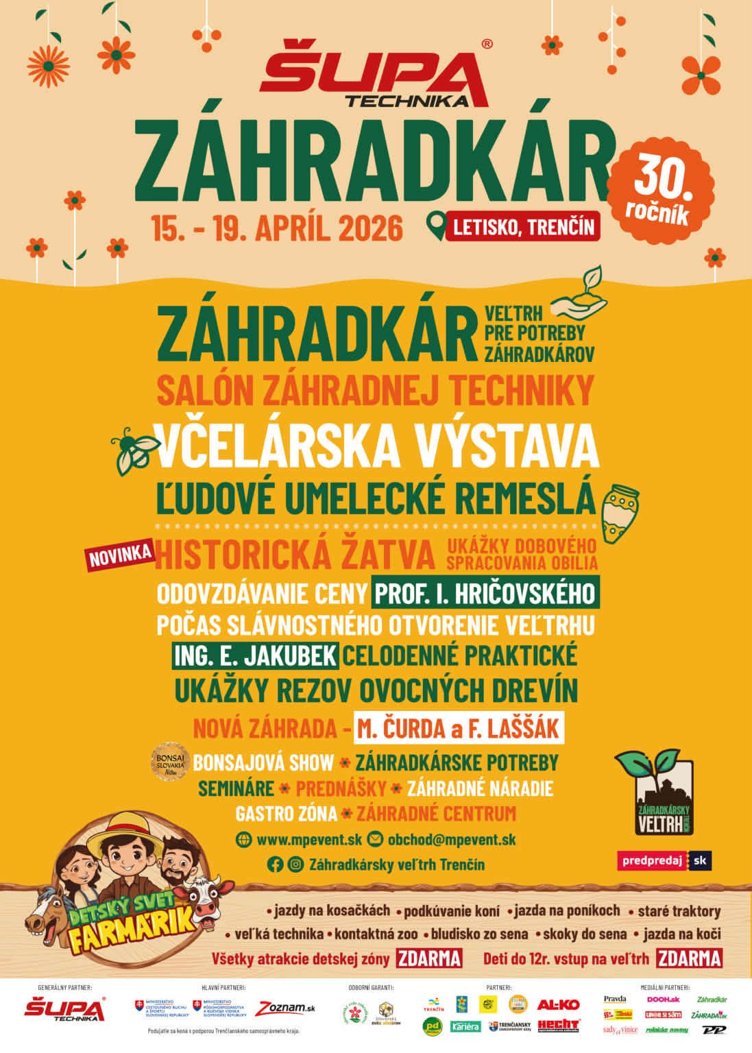 záhradkárske potreby, včelárska výstava, ľudové remeslá, ukážky rezov ovocných drevín, gastro zóna a mnoho ďalšieho