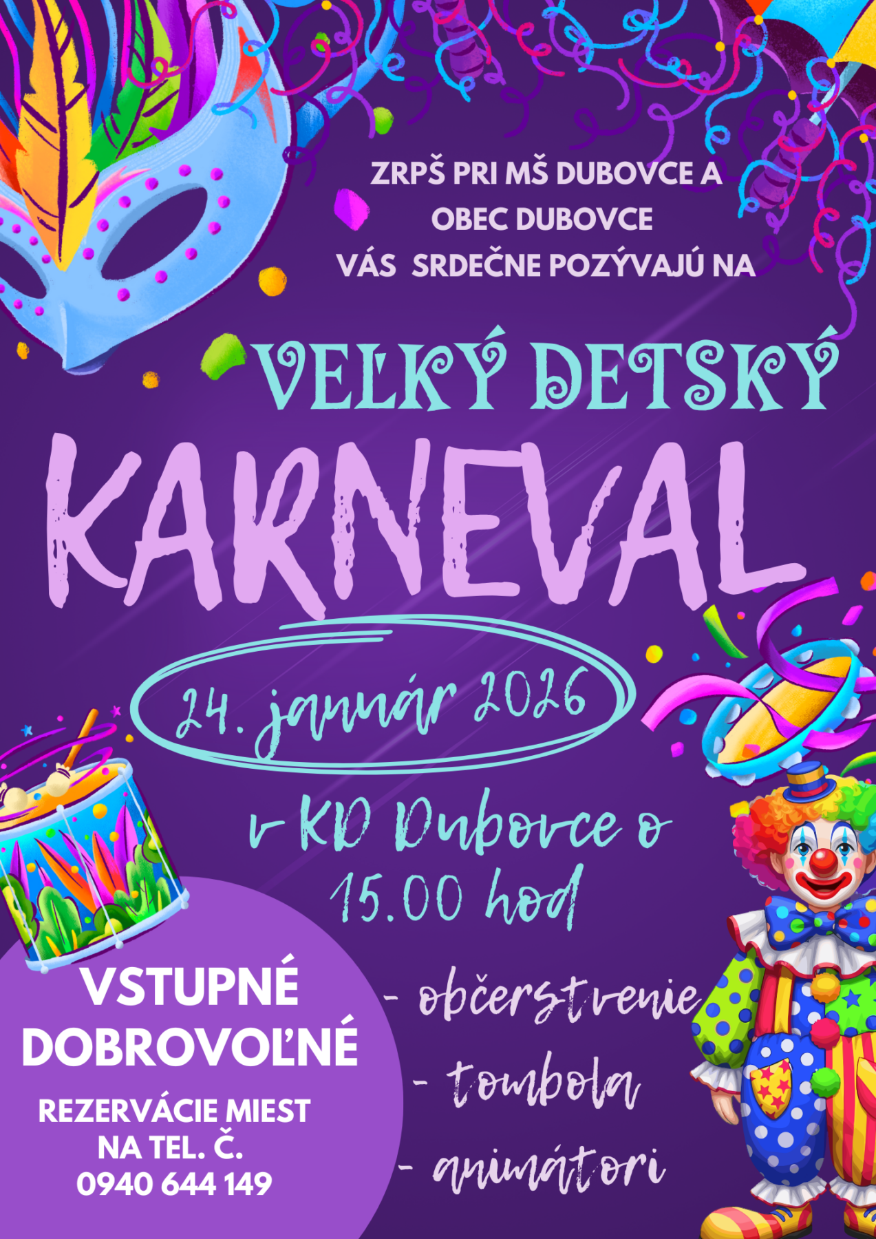 ZRPS pri MŠ Dubovce a Obec Dubovce srdečne pozývajú všetky deti (aj rodičov 😉) na farebný, veselý a poriadne rozbláznený karneval plný smiechu, tanca a zábavy!